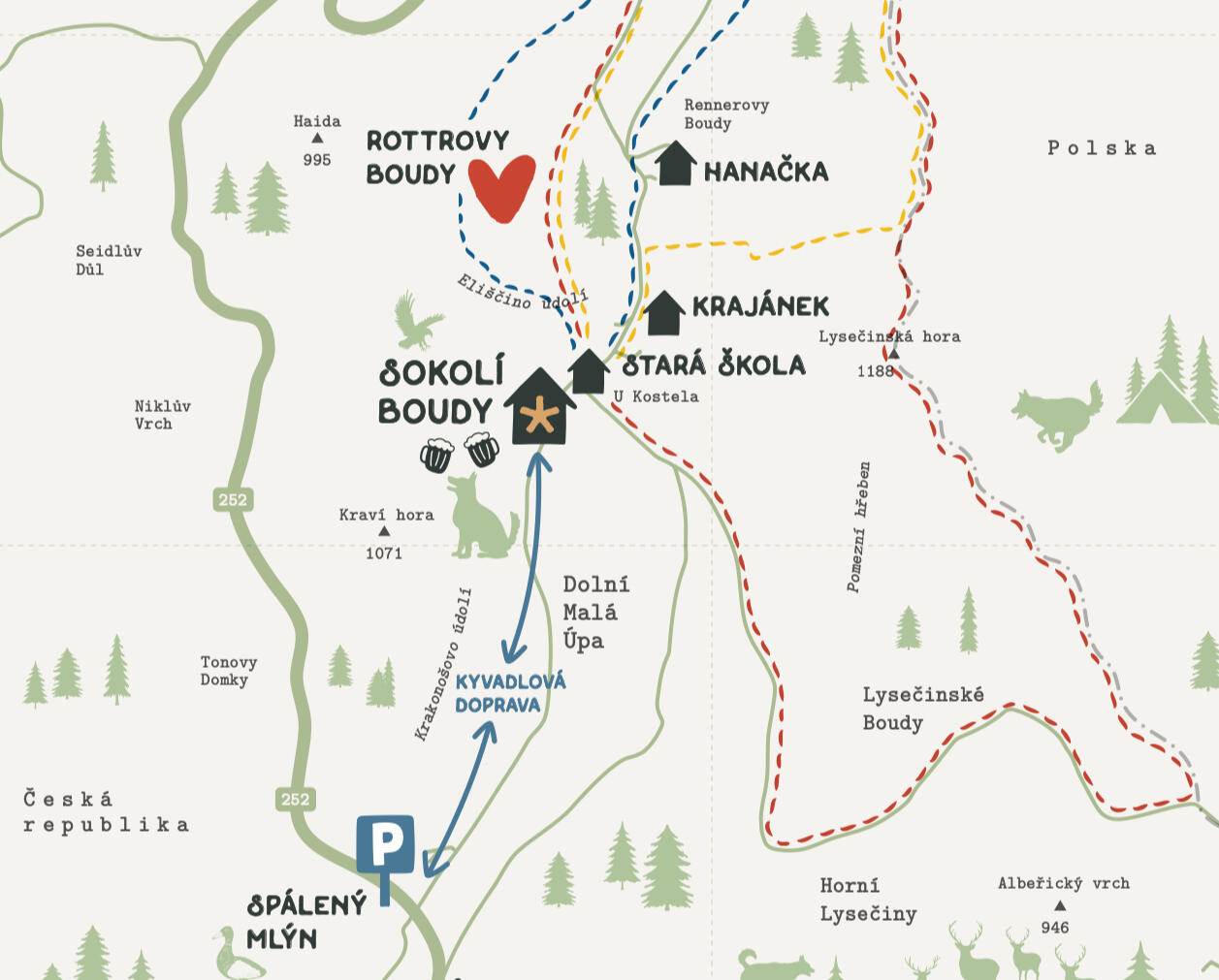 Jestli jste nikdy nebyli v tomhle údolí, je to další důvod přijet už v pátek!Podařilo se nám na celý víkend vybookovat téměř komplet Dolní Malou Úpu kolem kostela. Tudíž budeme všichni bydlet v dochozí vzdálenosti od Sokolích bud (někdo přímo v nich).Vaše konkrétní ubytování spolu domluvíme osobně, ale jsou to tyto boudy: